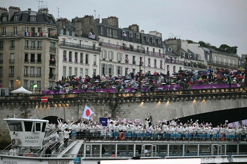 【7月27日 AFP】パリ五輪の開会式が26日に行われ、日本選手団がセーヌ(Seine)川で入場行進を行った。ブレイキン男子の半井重幸(Nakarai Shigeyuki)とフェンシング女子の江村美咲(Misaki Emura)が旗手を務めた。(c)AFP