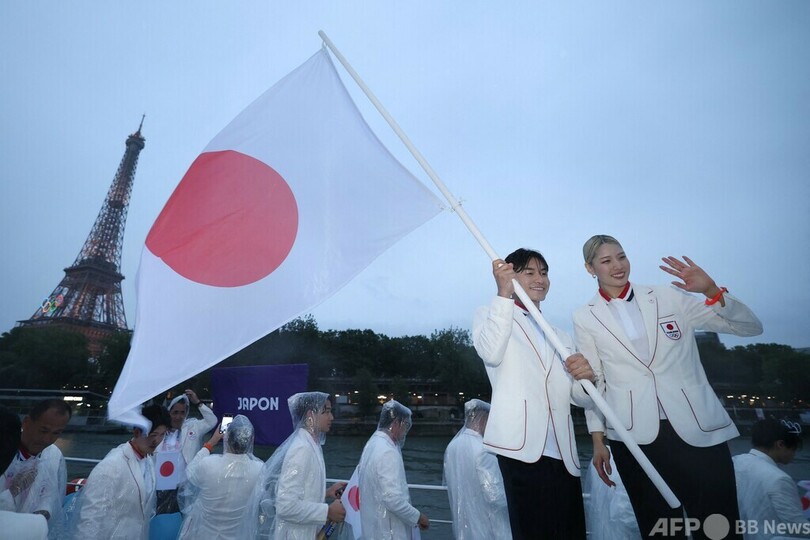 【7月27日 AFP】パリ五輪の開会式が26日に行われ、日本選手団がセーヌ(Seine)川で入場行進を行った。ブレイキン男子の半井重幸(Nakarai Shigeyuki)とフェンシング女子の江村美咲(Misaki Emura)が旗手を務めた。(c)AFP