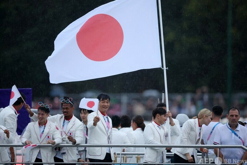 【7月27日 AFP】パリ五輪の開会式が26日に行われ、日本選手団がセーヌ(Seine)川で入場行進を行った。ブレイキン男子の半井重幸(Nakarai Shigeyuki)とフェンシング女子の江村美咲(Misaki Emura)が旗手を務めた。(c)AFP