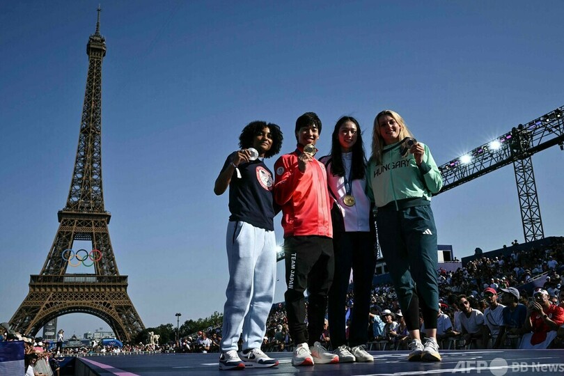 【7月30日 AFP】パリ五輪のスケートボード・女子ストリートで金メダルを獲得した吉沢恋(Coco Yoshizawa)と銀メダルに輝いた赤間凛音(Liz Akama)、フェンシング男子エペ個人で金メダルを手にした加納虹輝(Koki Kano)が29日、仏パリのトロカデロ広場(Trocadero Square)でエッフェル塔(Eiffel Tower)をバックに記念撮影に臨んだ。(c)AFP
