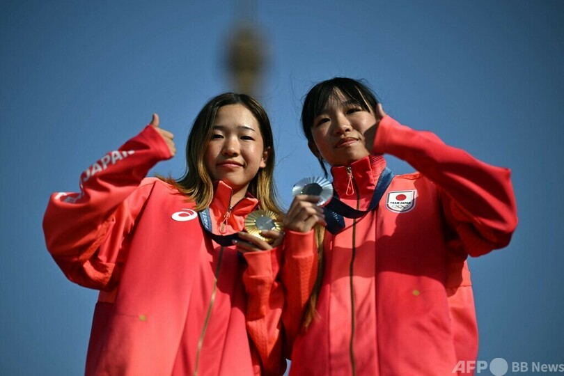 スケボー金銀の吉沢と赤間、エッフェル塔背に記念撮影 パリ五輪