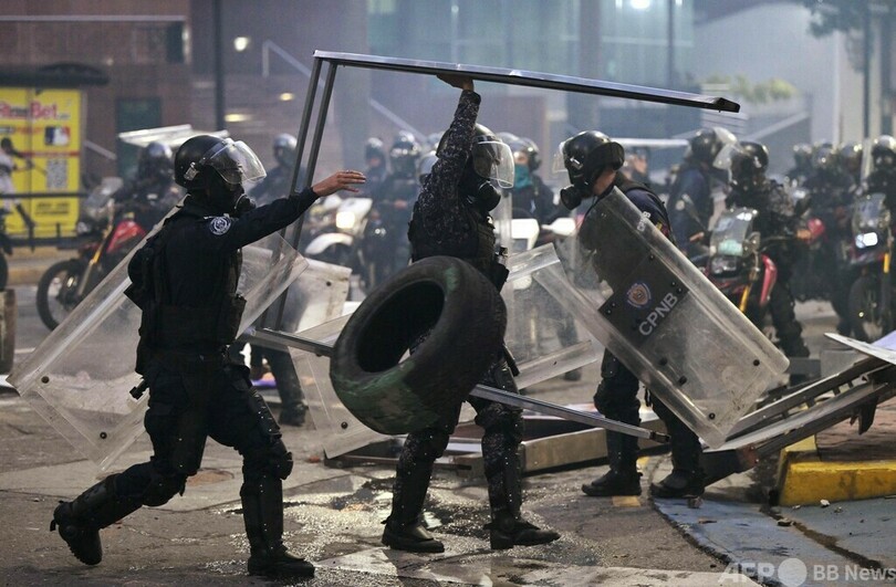 【7月30日 AFP】南米ベネズエラで29日、前日に投開票が行われた大統領選でニコラス・マドゥロ(Nicolas Maduro)大統領が再選したと発表されたことに抗議する大規模デモが行われた。治安部隊は催涙ガスやゴム弾を使用して鎮圧を試みた。マドゥロ氏の勝利をめぐっては、野党や国際社会からも疑問視されている。