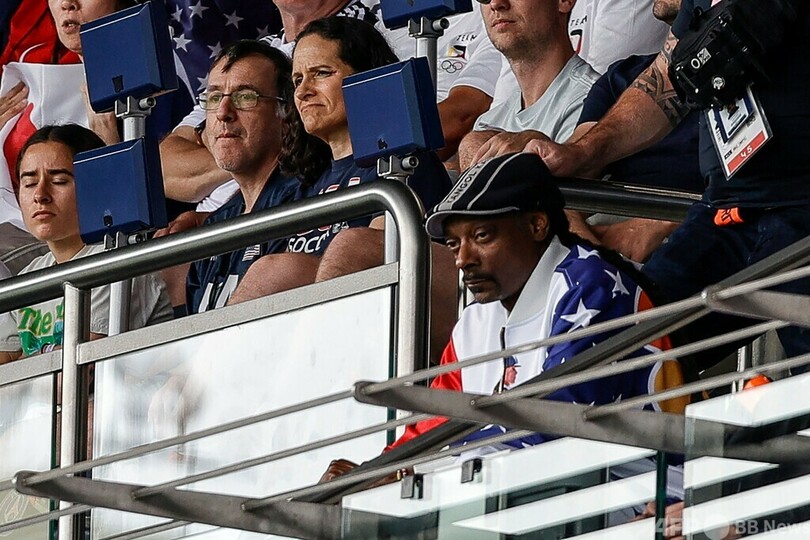 黒のヘルメット、手袋、ジャケット、白いシャツ、そしてサングラスとS字形のブローチを身に着けたスヌープ・ドッグさんは、米NBCテレビのパリ五輪特別特派員として1万5000人が入った観客席を訪れた。