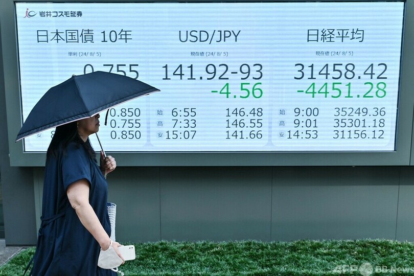 【8月5日 AFP】5日の東京株式市場の日経平均株価(Nikkei 225)は、前週末比4451円28銭(12.40%)安となる3万1458円42銭で終了した。終値ベースでの下げ幅は、過去最大。