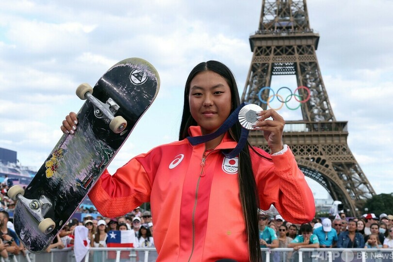 【8月8日 AFP】パリ五輪のスケートボード女子パークで銀メダルを獲得した開心那(Kokona Hiraki)が7日、仏パリのトロカデロ広場(Trocadero Square)でエッフェル塔(Eiffel Tower)をバックに記念撮影に臨んだ。(c)AFP