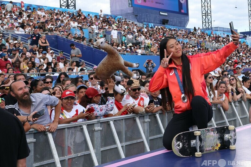 【8月8日 AFP】パリ五輪のスケートボード女子パークで銀メダルを獲得した開心那(Kokona Hiraki)が7日、仏パリのトロカデロ広場(Trocadero Square)でエッフェル塔(Eiffel Tower)をバックに記念撮影に臨んだ。(c)AFP