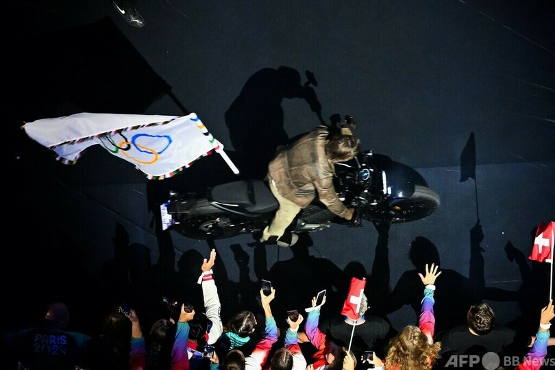 2028年のロサンゼルス五輪への五輪旗引継ぎに続いて、クルーズさんはスタジアムの屋根から飛び降りて登場。五輪旗を手にするとバイクにまたがり、スタジアムを後にした。