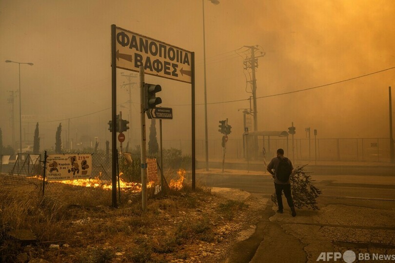 アテネ通信社(ANA)によると、13日早朝には今回の山火事で初めて死者が確認された。アテネで工場の焼け跡から発見された遺体は、60歳前後の女性とみられている。(c)AFP