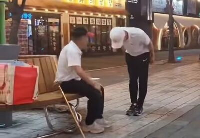 映像には、大尉が円形ベンチに座る老人に丁寧に口座番号を尋ねる様子が映っている。老人が感謝の意を示し立ち上がり握手を求めると、大尉は深く腰を折り、敬意を表して老人の手を握った。