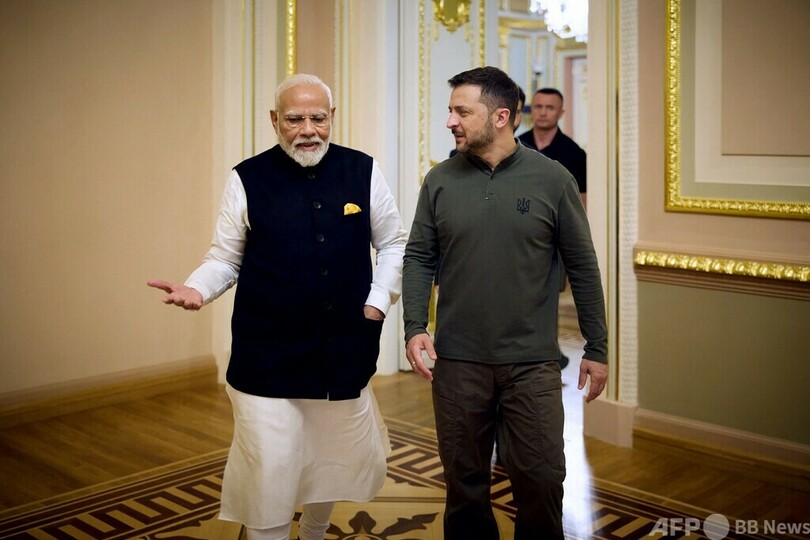 ロシア・モスクワを先月訪問し、ウラジーミル・プーチン(Vladimir Putin)大統領と抱擁してウクライナ人の怒りを買ったモディ氏は23日、ウクライナの首都キーウを訪れ、ウォロディミル・ゼレンスキー(Volodymyr Zelensky)大統領に対し、「いかなる問題も戦場で解決すべきではない」と伝えた。