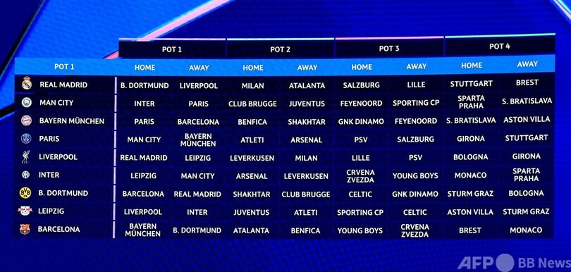 【8月30日 AFP】サッカー欧州チャンピオンズリーグ(UEFA Champions League 2024-25)は29日、新方式のリーグステージ組み合わせ抽選が行われ、王者レアル・マドリード(Real Madrid、スペイン)はホームで昨季決勝でも対戦したボルシア・ドルトムント(Borussia Dortmund、ドイツ)と、敵地でリバプール(Liverpool FC、イングランド)との対戦が決まった。