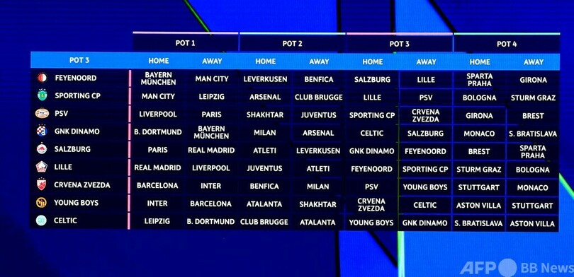 【8月30日 AFP】サッカー欧州チャンピオンズリーグ(UEFA Champions League 2024-25)は29日、新方式のリーグステージ組み合わせ抽選が行われ、王者レアル・マドリード(Real Madrid、スペイン)はホームで昨季決勝でも対戦したボルシア・ドルトムント(Borussia Dortmund、ドイツ)と、敵地でリバプール(Liverpool FC、イングランド)との対戦が決まった。