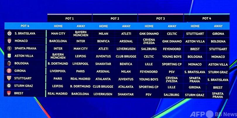 【8月30日 AFP】サッカー欧州チャンピオンズリーグ(UEFA Champions League 2024-25)は29日、新方式のリーグステージ組み合わせ抽選が行われ、王者レアル・マドリード(Real Madrid、スペイン)はホームで昨季決勝でも対戦したボルシア・ドルトムント(Borussia Dortmund、ドイツ)と、敵地でリバプール(Liverpool FC、イングランド)との対戦が決まった。