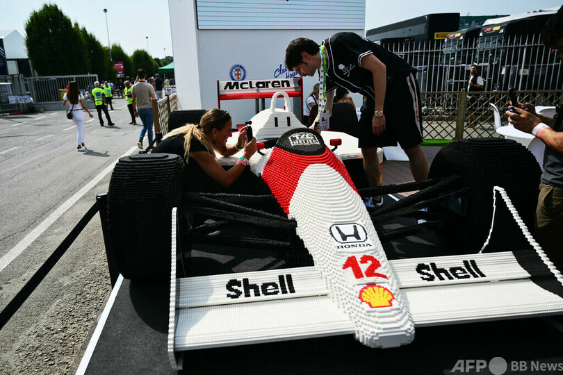 【9月1日 AFP】24F1第16戦イタリアGP(Italian Grand Prix 2024)の会場で31日、レゴブロックで再現したマクラーレン(McLaren)時代のアイルトン・セナ(Ayrton Senna)氏のマシンが展示された。(c)AFP
