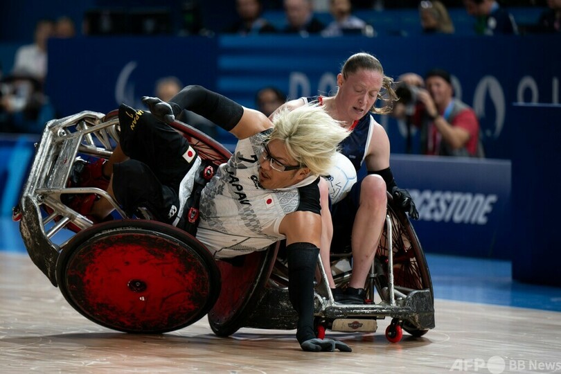 【9月9日 AFP】パリ・パラリンピックの車いすラグビー決勝で金メダルを獲得し、抱き合って喜ぶ日本代表の長谷川勇基 (Yuki Hasegawa、左)と橋本勝也 (Katsuya Hashimoto、右)。会場は仏パリのシャン・ド・マルス・アリーナ(Champ de Mars Arena)。(c)AFP