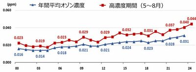 また、オゾン注意報の発令日数も2015年の3日から2024年8月末時点で31日と約10倍に増加し、発令回数も4回から109回に急増した。注意報解除までの時間も2019年の2.6時間から2024年には3.2時間に延びている。