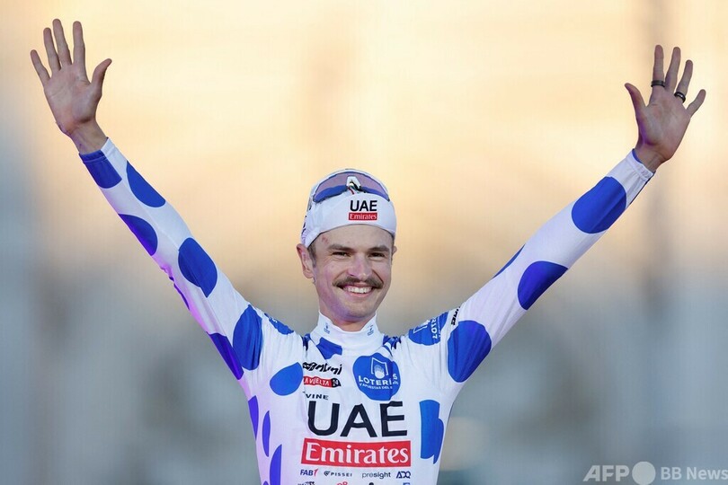 ポイント賞はアルペシン・ドゥクーニンク(Alpecin–Deceuninck)のカーデン・グローブス(Kaden Groves、オーストラリア)、山岳賞はUTE(UAE TEAM EMIRATES)のジェイ・バイン(Jay Vine、オーストラリア)がそれぞれ獲得した。(c)AFP