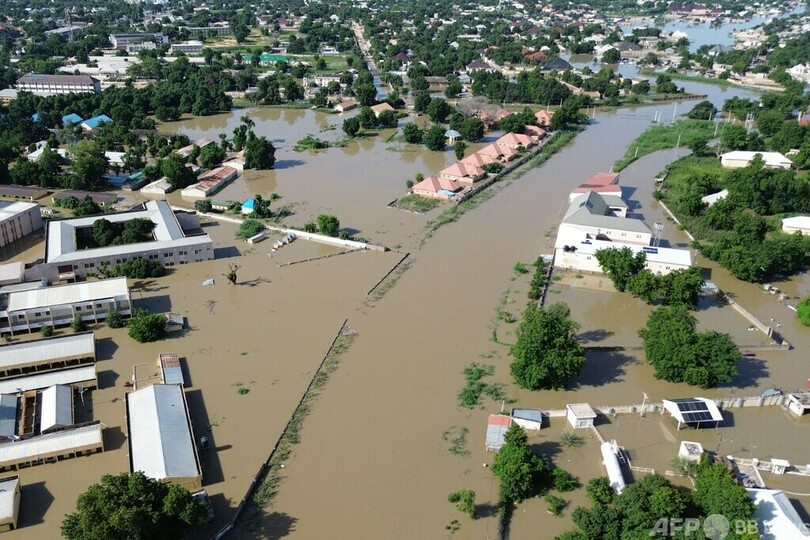 【9月11日 AFP】ナイジェリア北東部ボルノ(Borno)州の州都マイドゥグリ(Maiduguri)が、大規模な洪水被害に見舞われている。国家緊急事態管理庁(NEMA)がAFPと共有した複数の空撮ビデオと写真からは、濁った水に漬かった市街地の様子が確認できた。