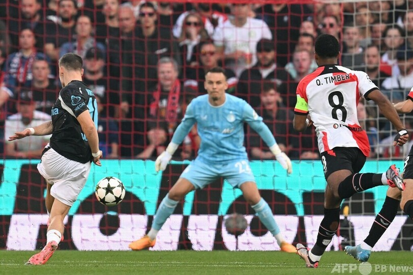 シャビ・アロンソ(Xabi Alonso)監督率いるレバークーゼンは、現在リバプール(Liverpool FC)を率いるアルネ・スロット(Arne Slot)監督が指揮していたころの見る影もないフェイエノールトを、攻撃のスピードと正確性で圧倒。ビルツの2得点、アレハンドロ・グリマルド(Alejandro Grimaldo)のゴール、そして相手オウンゴールも決まり、前半のうちに試合を決めた。(c)AFP