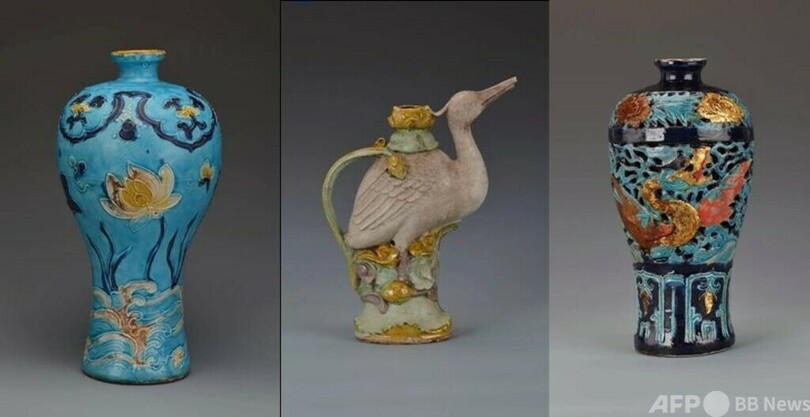 展示の目玉は彩釉磁器で、計13点(セット)の逸品が展示されます。考古学における彩釉磁器の発見は非常にまれで、沈没船で発見されたのは初めてです。これらの考古学の発見は明代(1368-1644)中期に景徳鎮の彩釉磁器が輸出されていたことを証明し、窯跡を探し、文化財の出所を明らかにするための実物資料が提供されました。また、紅緑彩の碗にある「丙寅年造」の銘は、沈没船が明代・正徳年間の1506年に使われていたことを証明しており、当時の南海交易路線の隆盛がうかがわれます。(c)CGTN Japanese/AFPBB News