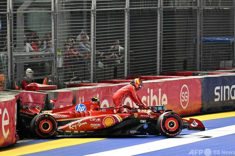 一方でフェラーリ勢にとっては悲惨な予選Q3となり、シャルル・ルクレール(Charles Leclerc)はトラックリミット違反によりタイムが抹消されて9番手、昨年の優勝者サインツはクラッシュにより10番手となった。(c)AFP/Daniel HICKS