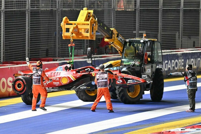 一方でフェラーリ勢にとっては悲惨な予選Q3となり、シャルル・ルクレール(Charles Leclerc)はトラックリミット違反によりタイムが抹消されて9番手、昨年の優勝者サインツはクラッシュにより10番手となった。(c)AFP/Daniel HICKS