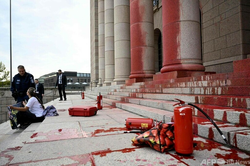 【9月26日 AFP】フィンランドで25日、環境活動家らが国会議事堂に赤いペンキを吹き付ける騒ぎがあった。