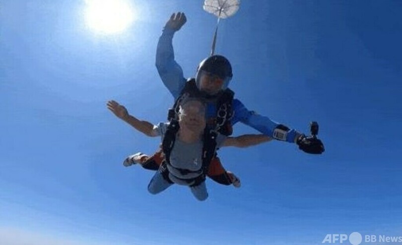 コーチは「スカイダイビングをすると軽いめまいなど不快感が出る人もいるが、陶さんは全く大丈夫だった。飛行機から飛び出した当初、おばあさんは緊張していたが、パラシュートが開いてゆっくり降下し始めると、私とおしゃべりできるほどリラックスしていた」と感想を述べました。(c)CGTN Japanese/AFPBB News