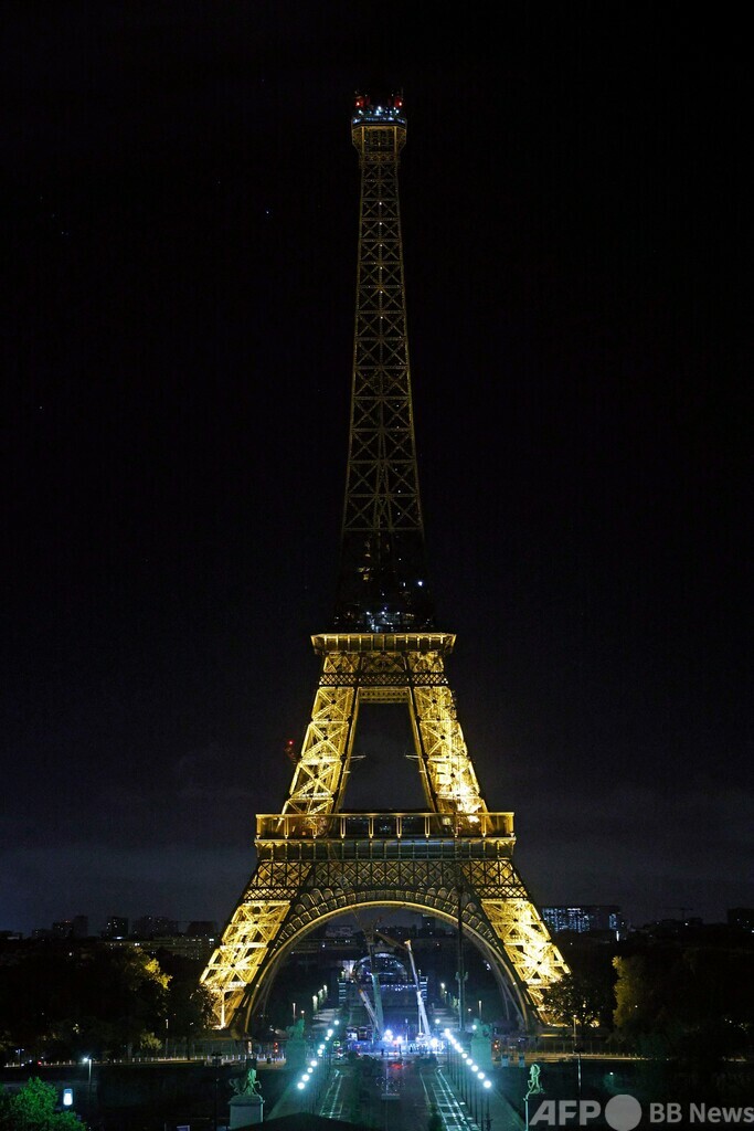 エッフェル塔ではこの日、作業員が早朝から複数の大型クレーンを操作し、1階と2階の間に設置されていた重さ30トンの鉄製リングを取り外した。約4か月前の6月7日に設置されたこのシンボルは、これから溶かして再利用されることになっている。