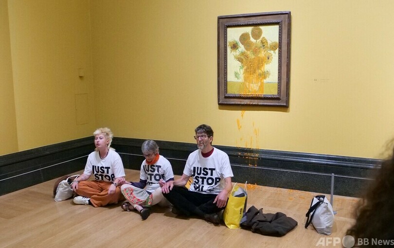 【9月28日 AFP】英ロンドンのナショナル・ギャラリー(National Gallery)で27日、オランダの画家ビンセント・ファン・ゴッホ(Vincent van Gogh)の名画「ひまわり(Sunflowers)」2作に環境団体の活動家がスープとみられる液体をかけ、3人が逮捕された。