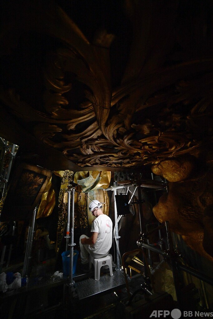 【10月9日 AFP】バチカンのサンピエトロ大聖堂(St Peter's Basilica)で、巨大な祭壇を覆う大天蓋(バルダッキーノ)の修復作業が250年ぶりに行われている。8日、その一部が公開され、輝きを新たにした数世紀前の金箔(きんぱく)が垣間見られた。