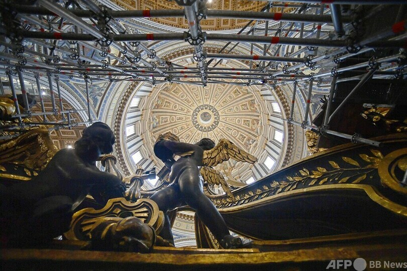 【10月9日 AFP】バチカンのサンピエトロ大聖堂(St Peter's Basilica)で、巨大な祭壇を覆う大天蓋(バルダッキーノ)の修復作業が250年ぶりに行われている。8日、その一部が公開され、輝きを新たにした数世紀前の金箔(きんぱく)が垣間見られた。