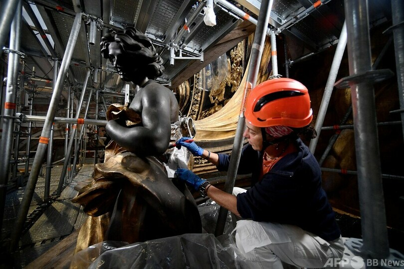 【10月9日 AFP】バチカンのサンピエトロ大聖堂(St Peter's Basilica)で、巨大な祭壇を覆う大天蓋(バルダッキーノ)の修復作業が250年ぶりに行われている。8日、その一部が公開され、輝きを新たにした数世紀前の金箔(きんぱく)が垣間見られた。
