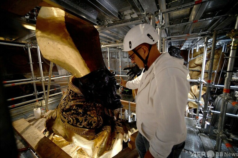 【10月9日 AFP】バチカンのサンピエトロ大聖堂(St Peter's Basilica)で、巨大な祭壇を覆う大天蓋(バルダッキーノ)の修復作業が250年ぶりに行われている。8日、その一部が公開され、輝きを新たにした数世紀前の金箔(きんぱく)が垣間見られた。