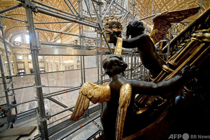 【10月9日 AFP】バチカンのサンピエトロ大聖堂(St Peter's Basilica)で、巨大な祭壇を覆う大天蓋(バルダッキーノ)の修復作業が250年ぶりに行われている。8日、その一部が公開され、輝きを新たにした数世紀前の金箔(きんぱく)が垣間見られた。