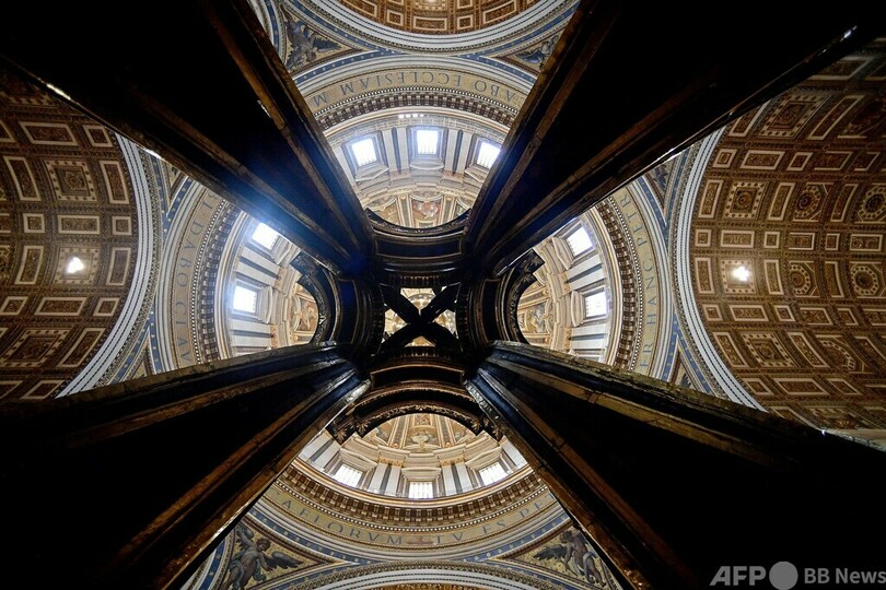【10月9日 AFP】バチカンのサンピエトロ大聖堂(St Peter's Basilica)で、巨大な祭壇を覆う大天蓋(バルダッキーノ)の修復作業が250年ぶりに行われている。8日、その一部が公開され、輝きを新たにした数世紀前の金箔(きんぱく)が垣間見られた。