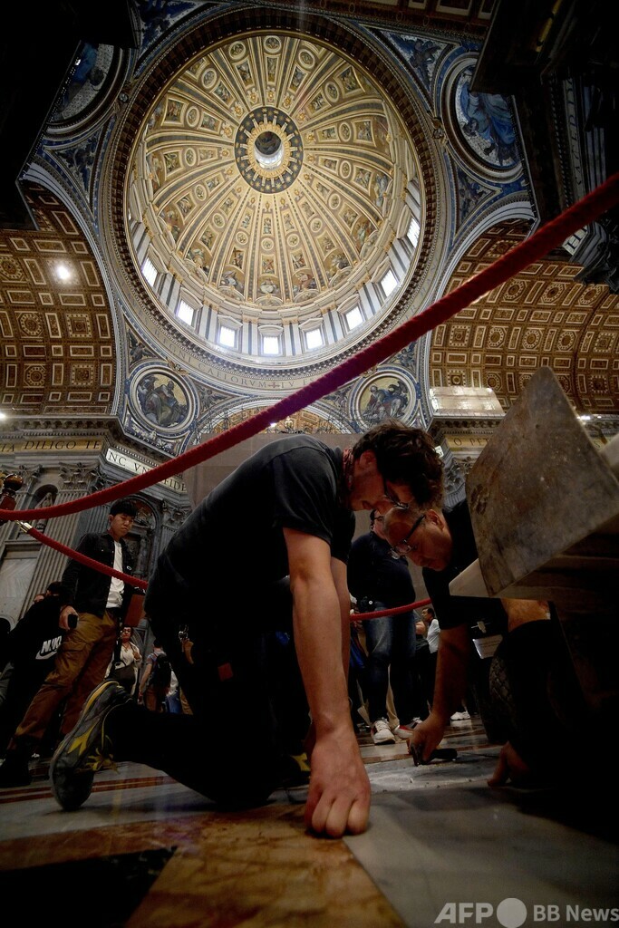 【10月9日 AFP】バチカンのサンピエトロ大聖堂(St Peter's Basilica)で、巨大な祭壇を覆う大天蓋(バルダッキーノ)の修復作業が250年ぶりに行われている。8日、その一部が公開され、輝きを新たにした数世紀前の金箔(きんぱく)が垣間見られた。