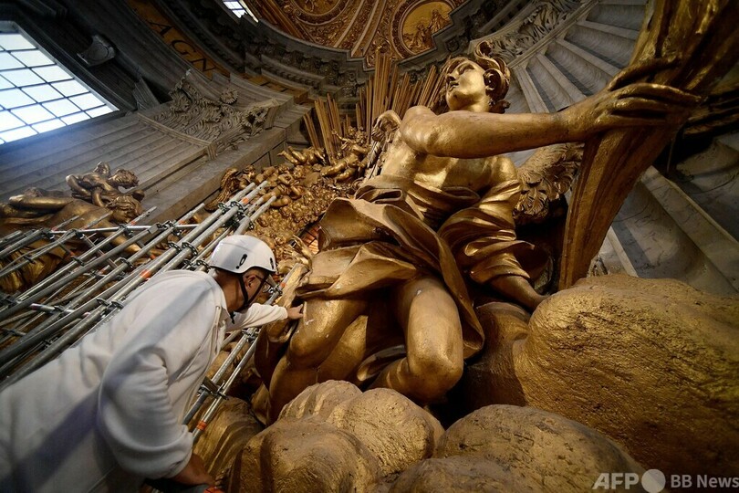 【10月9日 AFP】バチカンのサンピエトロ大聖堂(St Peter's Basilica)で、巨大な祭壇を覆う大天蓋(バルダッキーノ)の修復作業が250年ぶりに行われている。8日、その一部が公開され、輝きを新たにした数世紀前の金箔(きんぱく)が垣間見られた。
