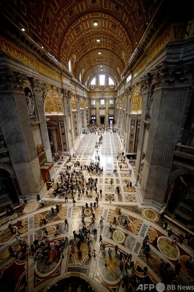 【10月9日 AFP】バチカンのサンピエトロ大聖堂(St Peter's Basilica)で、巨大な祭壇を覆う大天蓋(バルダッキーノ)の修復作業が250年ぶりに行われている。8日、その一部が公開され、輝きを新たにした数世紀前の金箔(きんぱく)が垣間見られた。