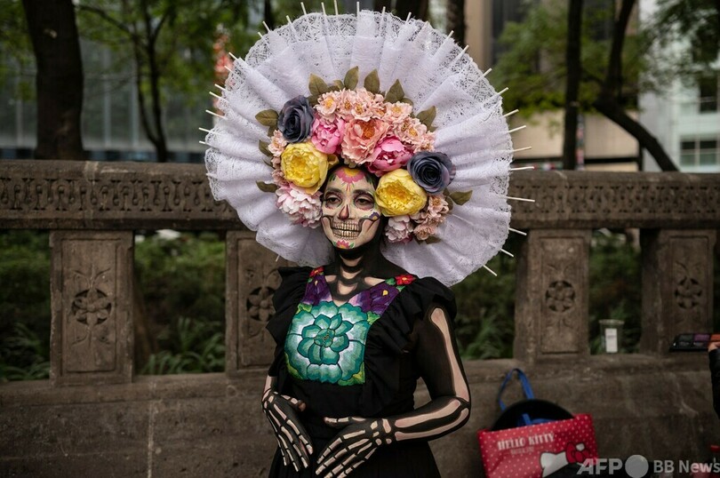 【10月15日 AFP】メキシコの「死者の日(Day of the Dead)」に、伝統的な骸骨の貴婦人カトリーナ(La Catrina)のフェイスペイント姿でポーズを取る女性。メキシコ市のレフォルマ通り(Reforma Avenue)で。(c)AFP