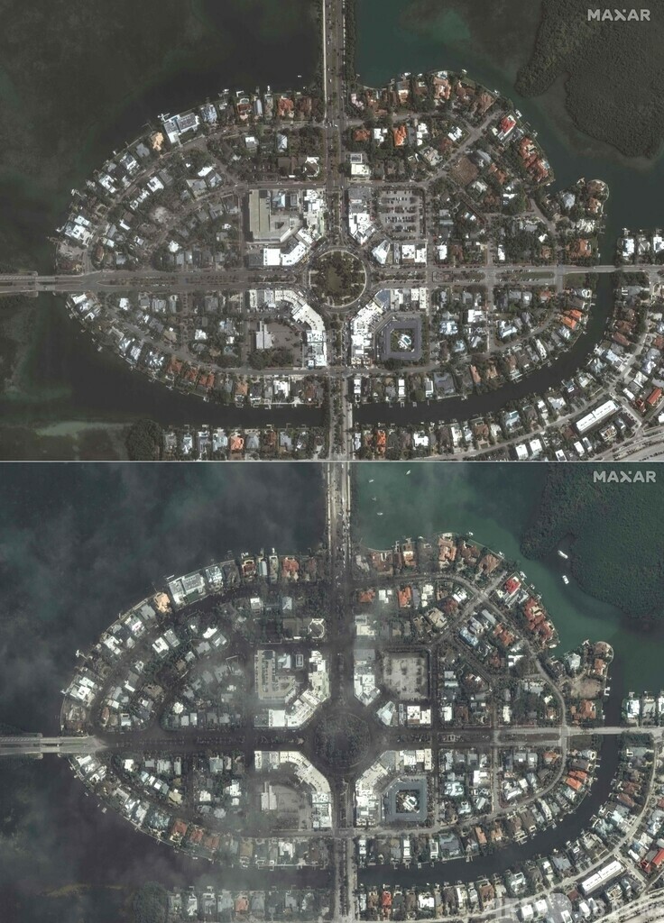 米宇宙技術会社マクサー・テクノロジーズ(Maxar Technologies)による衛星画像では、ハリケーン直撃前後の様子が確認できる。