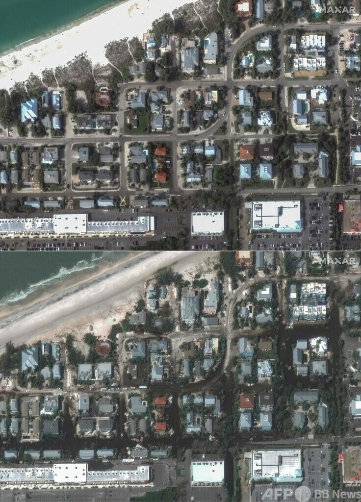 【10月11日 AFP】米フロリダ州に9日に上陸したハリケーン「ミルトン(Milton)」。猛烈な強風を伴うハリケーンの爪痕を捉えた衛星画像が10日、公開された。同州は2週間前にも別のハリケーンの直撃を受けたばかりだった。