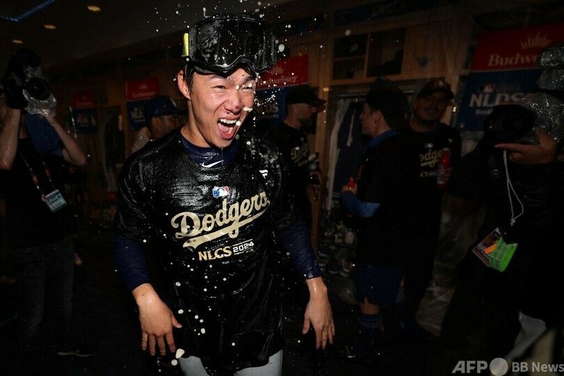 ドジャースの大谷翔平(Shohei Ohtani)と山本由伸(Yoshinobu Yamamoto)は試合後、シャンパンファイトでチームメートと喜びを分かち合った。(c)AFP