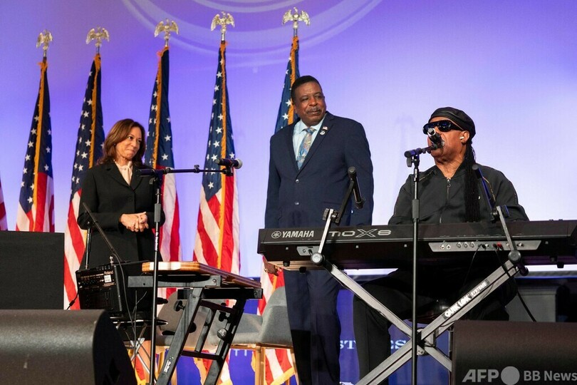 ミュージシャンのスティービー・ワンダー(Stevie Wonder)さんも登壇し、自身の楽曲「Happy Birthday」を歌ってハリス氏の誕生日を祝った。