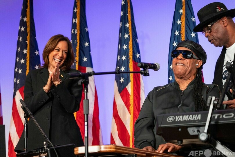 ミュージシャンのスティービー・ワンダー(Stevie Wonder)さんも登壇し、自身の楽曲「Happy Birthday」を歌ってハリス氏の誕生日を祝った。