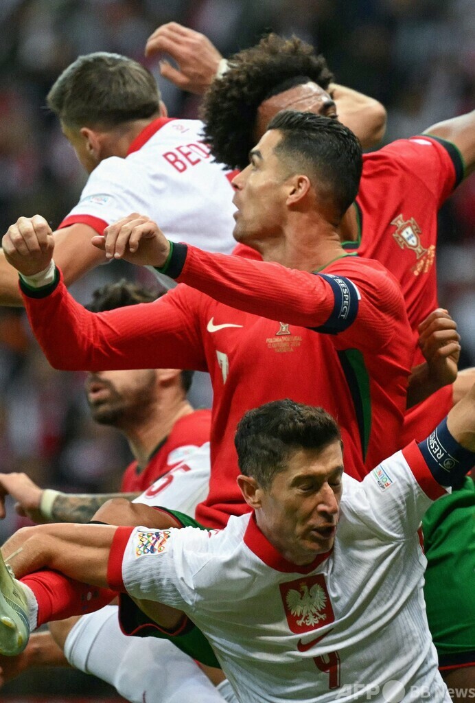 【10月27日 AFP】サッカーUEFAネーションズリーグ(UEFA Nations League 2024-25)、リーグA・グループ1、ポーランド対ポルトガル。ボールを競るポルトガルのクリスティアーノ・ロナウド(Cristiano Ronaldo、中央)、ポーランドのロベルト・レワンドフスキ(Robert Lewandowski、中央下)ら。ポーランド・ワルシャワの国立競技場で。(c)AFP