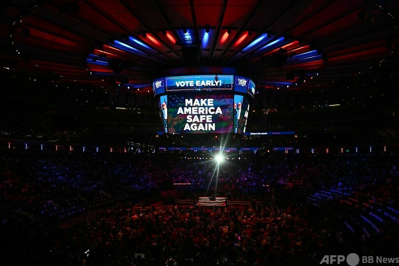一方で、マディソン・スクエア・ガーデンは1939年にナチス・ドイツ(Nazi)の指導者アドルフ・ヒトラー(Adolf Hitler)を支持する極右の集会会場にもなった経緯があり、メディア報道には、トランプ氏の集会とナチスを関連付ける論調も見られた。(c)AFP