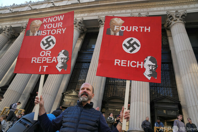 一方で、マディソン・スクエア・ガーデンは1939年にナチス・ドイツ(Nazi)の指導者アドルフ・ヒトラー(Adolf Hitler)を支持する極右の集会会場にもなった経緯があり、メディア報道には、トランプ氏の集会とナチスを関連付ける論調も見られた。(c)AFP