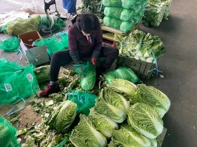 30年間にわたり白菜の卸売業をしている70代の女性は、市場の片隅で他の卸売業者5人と一緒に山のように積まれた白菜を包丁で手入れしていた。白菜の大きさに応じて3個ずつ束ねて網に入れ、商品価値が低い白菜は取り除いた。このようにして網に入れた白菜はトラックに積まれる。