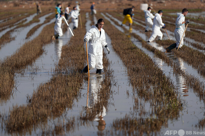 【11月20日 AFP】スペイン東部バレンシア州の大規模な洪水を受け、カタロハ近くのアルブフェーラ国立公園の水田で、棒を使って犠牲者を捜索するボランティア。この洪水は、欧州において過去数十年間で最も深刻な被害をもたらした。特にバレンシア州では、少なくとも220人が死亡、数十人が行方不明となり、町全体が泥に埋まった。(c)AFP